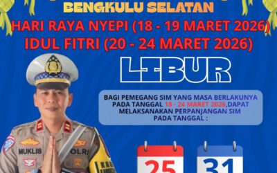 BENGKULU SELATAN – Satuan Lalu Lintas (Satlantas) Polres Bengkulu Selatan resmi mengumumkan penyesuaian jadwal pelayanan Surat Izin Mengemudi (SIM) dalam rangka peringatan Hari Raya Nyepi dan Hari Raya Idul Fitri tahun 2026. Pengumuman tersebut disampaikan sebagai bentuk pelayanan informasi kepada masyarakat agar tidak mengalami kendala dalam pengurusan administrasi SIM, khususnya bagi pemegang SIM yang masa…