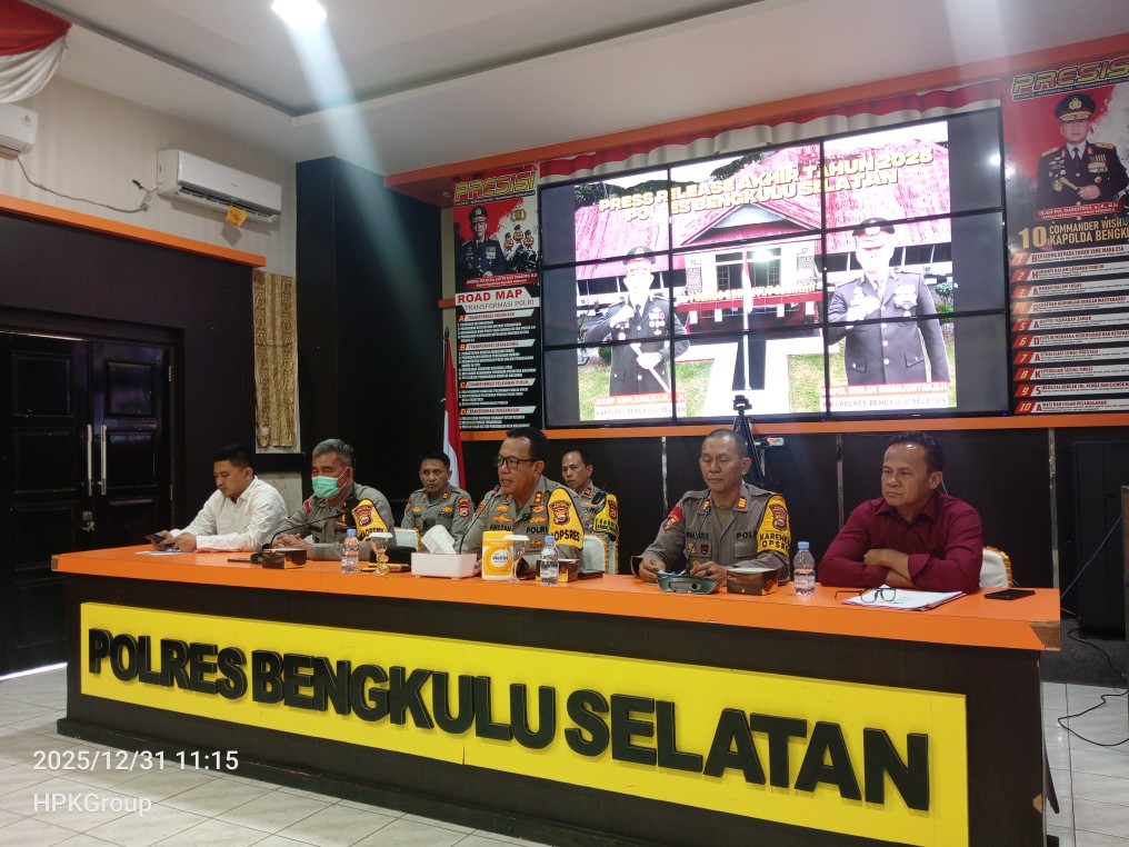 BENGKULU SELATAN – Kepolisian Resor (Polres) Bengkulu Selatan secara resmi menutup tahun 2025 dengan memaparkan capaian kinerja serta evaluasi situasi keamanan dan ketertiban masyarakat (Kamtibmas) dalam Konferensi Pers Rilis Akhir Tahun yang digelar di Aula Command Center Mapolres Bengkulu Selatan, Rabu (31/12/2025).