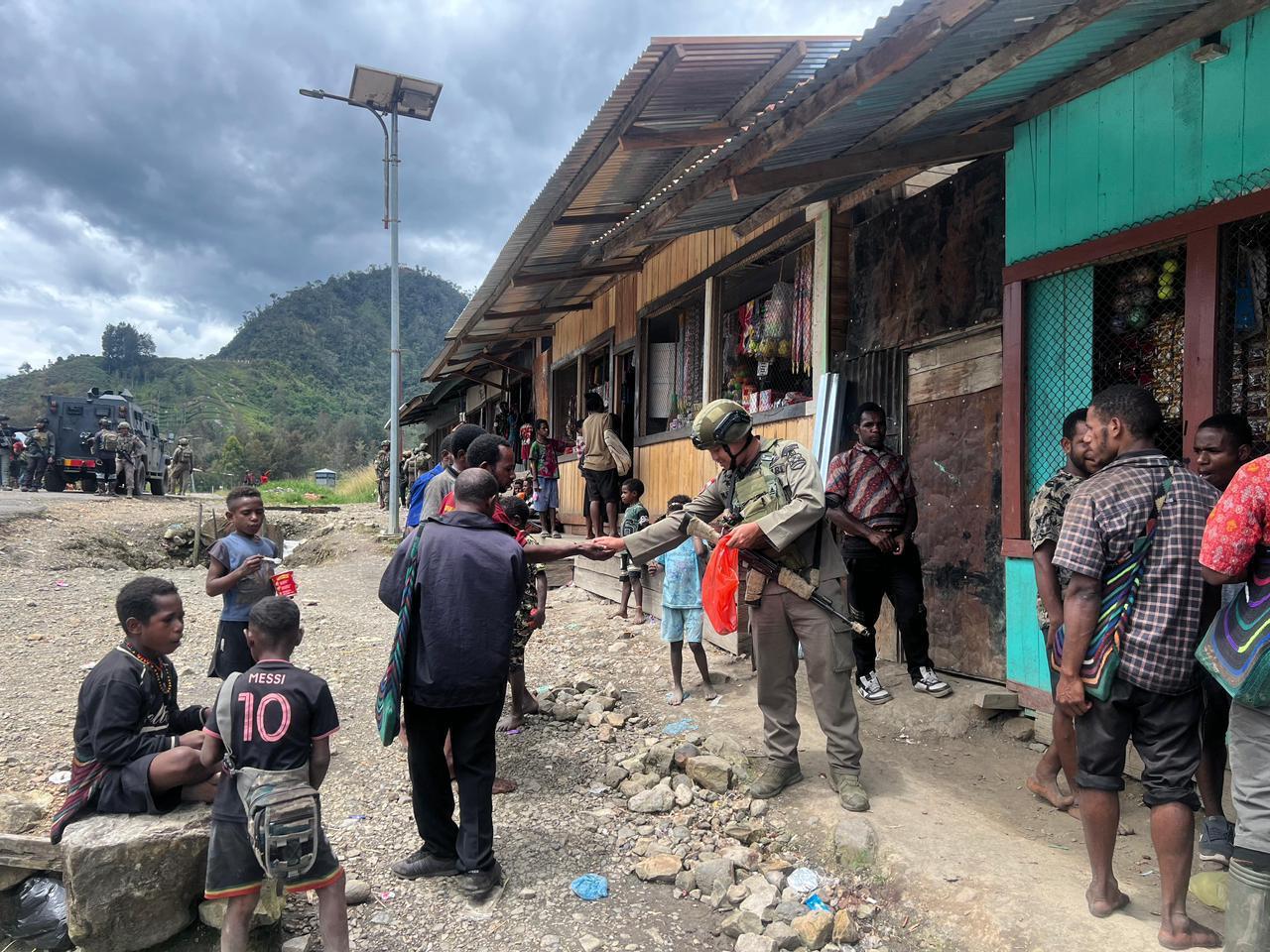 Hadirkan Pendekatan Diri dengan Masyarakat, Personel Ops Damai Cartenz Belanja dan Berbagi di Sinak