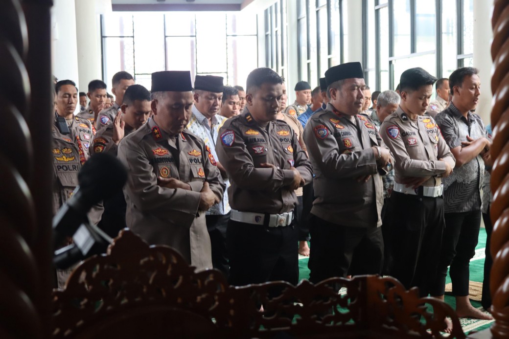 BENGKULU – Kapolda Bengkulu, Irjen Pol Mardiyono, S.I.K., M.Si. dan Pejabat Utama (PJU ) Polda Bengkulu serta seluruh personel Polda Bengkulu melaksanakan shalat gaib di Masjid Al-Amin Polda Bengkulu pada hari Jumat, 29 Agustus 2025.