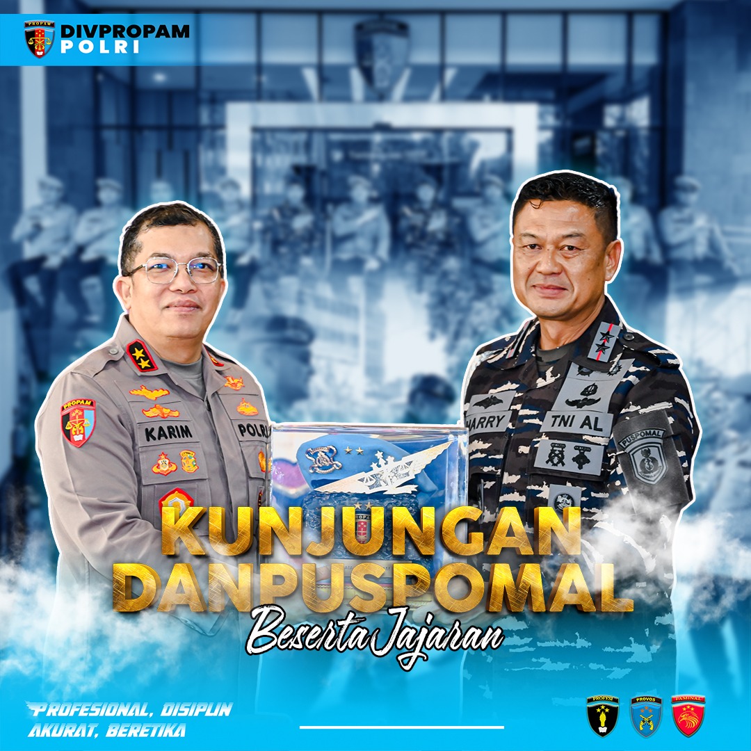 JAKARTA – Divisi Profesi dan Pengamanan (Divpropam) Polri menerima kunjungan silaturahmi dari Komandan Pusat Polisi Militer Angkatan Laut (Danpuspomal) Mayjen TNI (Mar) Harry Indarto, S.E., M.M. beserta rombongan, dalam suasana penuh keakraban dan kebersamaan.