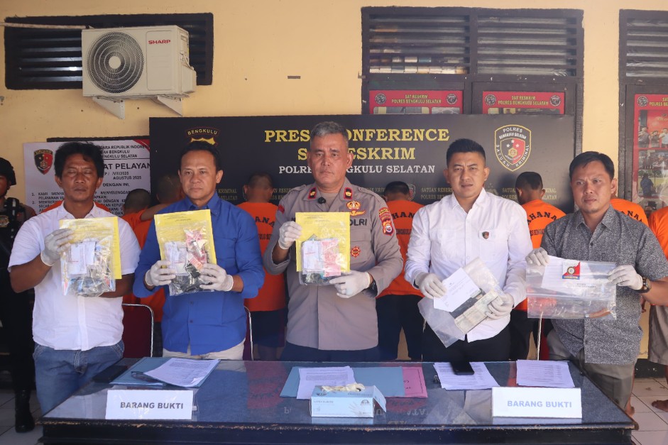 Kapolres Bengkulu Selatan AKBP Awilzan, SIK, MH melalui Waka Polres Kompol Berlan Simanjuntak, S.H didampingi Kasat Resnarkoba AKP Rabnus Supandri, S.Sos dan Kasat Reskrim Iptu M. Akhyar Anugerah, SH, MH, menyampaikan bahwa total terdapat 12 tersangka yang berhasil diamankan.